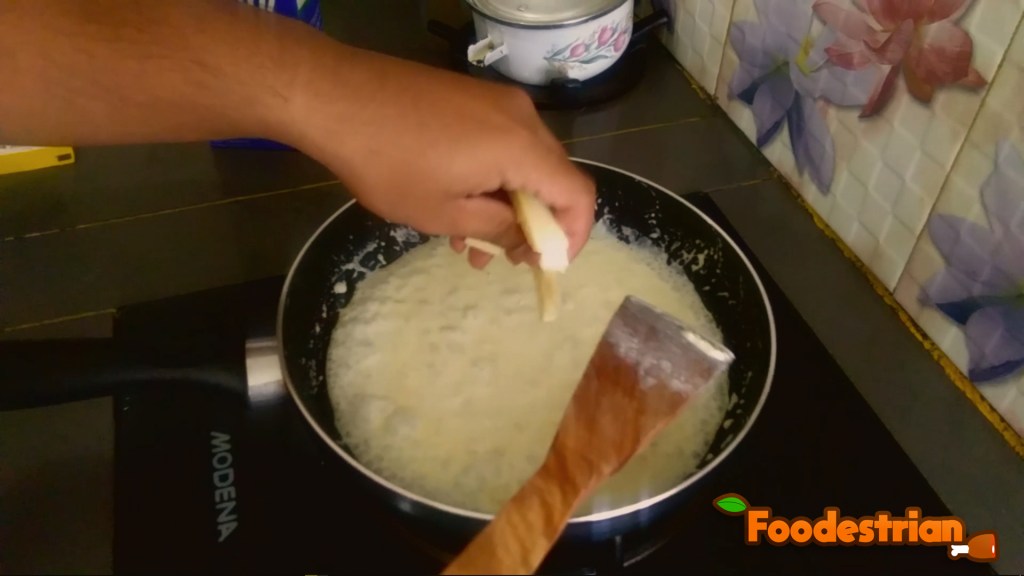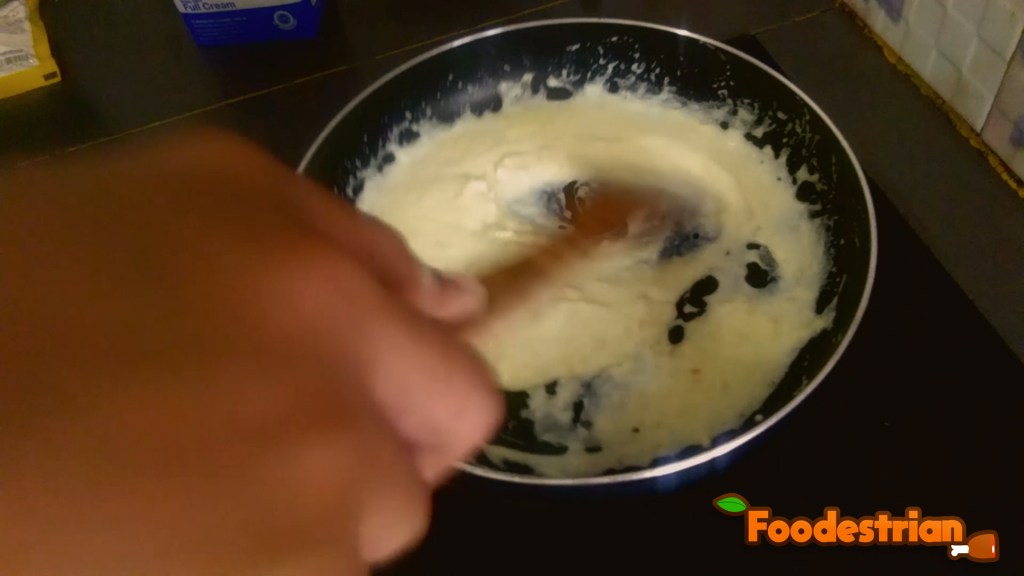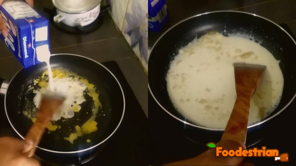- Masukkan susu cair ke dalamnya, lalu aduk hingga mendidih. Add liquid milk into it, then stir until it boils.